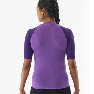 Una camiseta de manga corta de trail running para mujer con efecto segunda piel anti irritaciones que ofrece un soporte postural óptimo y una ventilación de alto rendimiento para correr a toda velocidad en trails.
