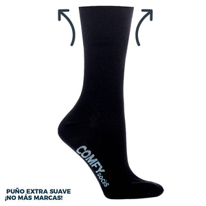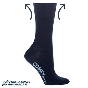 The Comfy Socks ¡El puño más Cómodo del mundo! PUÑO EXTRA SUAVE: Tecnología Suiza patentada. Tejido panal que moldea cuidadosamente los contornos naturales de las piernas, sin dejar marcas desagradables. TALÓN Y PUNTERA REFORZADAS: Tejido especial con mejor durabilidad. COSTURA PLANA: Confeccionado con la suave terminación de costura invisible en la puntera. Mucho más cómoda y confortable para los pies. TEJIDO CON BAMBOO NATURAL: El bamboo es una fibra natural vegetal 100% ecológica, antibacteriana, antiséptica, absorbente e inhibidora de olores. Su propiedad termorreguladora permite que los pies estén frescos en verano y cálidos en invierno.