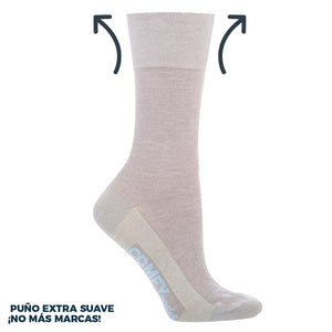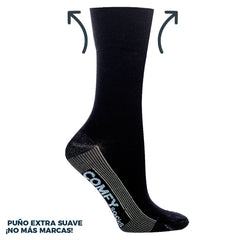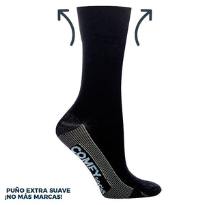 The Comfy Socks ¡El puño más cómodo del mundo! PUÑO EXTRA SUAVE: Tecnología Suiza patentada. Tejido panal que moldea cuidadosamente los contornos naturales de las piernas, sin dejar marcas desagradables. TALÓN Y PUNTERA REFORZADAS: Tejido especial con mejor durabilidad. COSTURA PLANA: Confeccionado con la suave terminación de costura invisible en la puntera. Mucho más cómoda y confortable para los pies. TEJIDO CON FIBRA COBRE: La fibra Incopper® de Copptech elimina el mal olor causado por hongos y bacterias. Mejora la tonalidad de la piel, reduce y elimina manchas, acelera los procesos de cicatrización y además, crea una barrera protectora contra las infecciones. verano y cálidos en invierno.