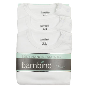Un básico que no puede faltar en la vida de tu bebé, son los Body Blancos Manga larga de Bambino, 100% algodón, su tela es gruesa para mantenerlo siempre calentito. El set incluye 3 unidades.