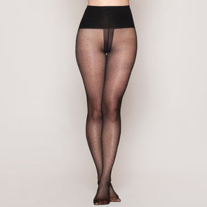 Panty de 20 denier con diseño de puntitos, transparente y mate, que estiliza la pierna sin brillo.