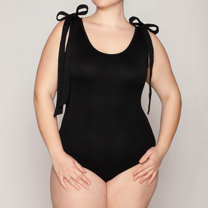 El escote redondo aporta un look clásico y versátil, mientras que los lazos en los hombros le dan un toque romántico y sofisticado. Sus broches ajustables en la parte inferior garantizan practicidad y un calce seguro. Composición: 80% microfibra, 20% spandex.