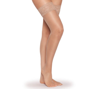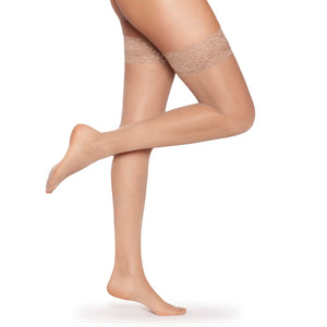Media Liga con banda de encaje con silicona para un ajuste seguro, calce en el muslo, mate sin brillo,15 denier.
