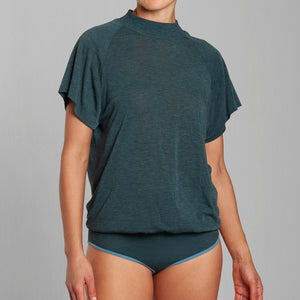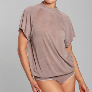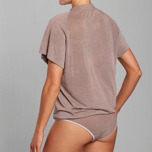 Body holgado Lasst, de manga corta raglán y cuello 1/2 beatle, confeccionado en fibra natural de bamboo seamless, suave, respirable y confortable. Su calce holgado aporta un look relajado y moderno, ideal para un estilo cómodo. Incorpora broches ajustables para mayor practicidad. Talla única, adaptable y cómoda. Una prenda versátil que equilibra diseño, naturalidad y sofisticación contemporánea.