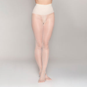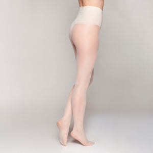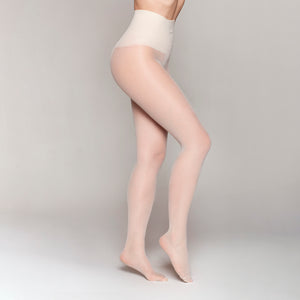 Panty elasticada, punta transparente. Ideal para usar con zapatos abiertos. 20 denier, cintura invisible, cuadro sin demarcación y rombo anatómico, pierna natural sin brillo y puntera transparente.