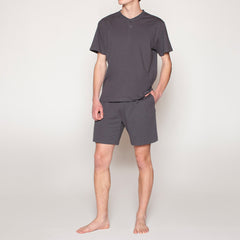 Este pijama de 2 piezas para hombre incluye una polera abotonada de diseño clásico y un short con bolsillos, ambos confeccionados en algodón suave y respirable que aporta frescura y confort durante la noche. Una opción práctica y versátil para quienes buscan descanso con calidad y estilo.
