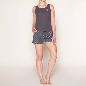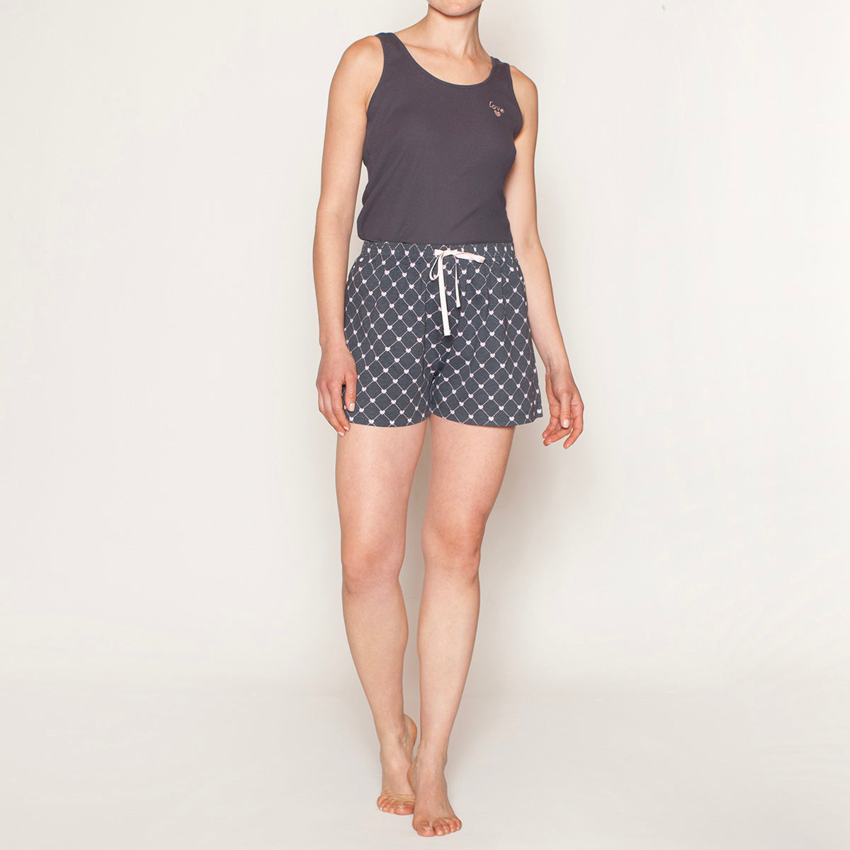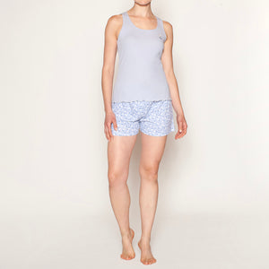 Este pijama de 2 piezas para mujer incluye una polera musculosa ligera y fresca, combinada con un rib short estampado que aporta un sutil toque de diseño. Confeccionado en algodón suave y transpirable, brinda una sensación de confort natural y libertad de movimiento, ideal para descansar o relajarte en casa.