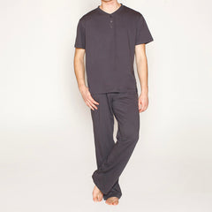 Este pijama de 2 piezas para hombre incluye una polera de cuello redondo con botones y un pantalón largo con bolsillos, ambos confeccionados en algodón suave y respirable que proporciona una sensación de frescura y comodidad. Un diseño clásico y funcional, ideal para disfrutar de tus momentos de relajación con total bienestar.