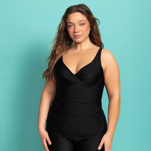 Descubre el equilibrio perfecto entre estilo y comodidad con este tankini de escote en V, ideal para realzar tu figura de forma natural. Su drapeado en el abdomen crea un efecto visual que estiliza y disimula, mientras los tirantes regulables ofrecen un ajuste firme y confortable.