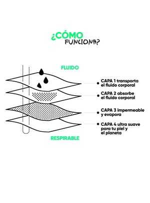 Innovadoratecnología de absorción anti-fugas de BloodyGreen testado en laboratorio de ingeniería de textil. No será necesario combinar con otro tipo de protección. No te sentirás húmeda.