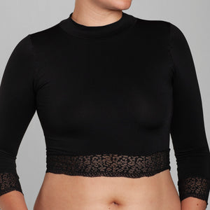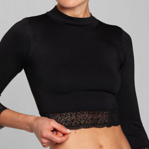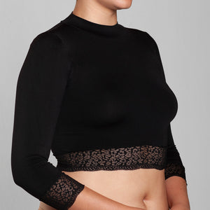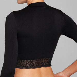 Crop Top seamless Lasst, confeccionado en microfibra suave y elasticada, con un diseño exclusivo que estiliza y realza la silueta. Su calce perfecto se adapta cómodamente al cuerpo gracias a su talla única. Incorpora cuello alto y mangas largas, destacando delicados puños con encaje que aportan un toque femenino, sofisticado y de inspiración couture. Ideal para elevar looks de día o de noche con identidad y estilo.